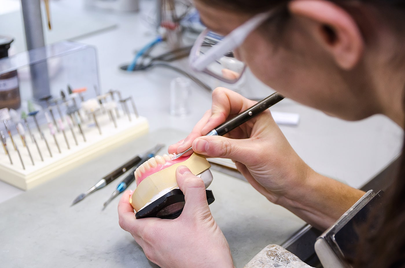 Um Ihrem Wunsch nach hochwertigem und ästhetischem Zahnersatz sowie Ihren individuellen Ansprüchen besser gerecht werden zu können, verfügt unsere Zahnarztpraxis über ein eigenes zahntechnisches Meisterlabor. Bis auf nur wenige Ausnahmen können wir hier die gesamte Zahntechnik herstellen.